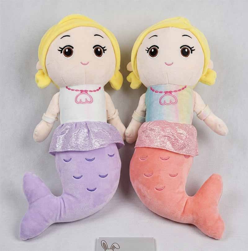 Dive into a world of imagination with these enchanting 45cm Mermaid Plush Dolls. These beautiful companions feature soft golden hair, friendly embroidered faces, and a touch of underwater magic. Each doll is styled with a shimmering, iridescent waist ruffle and a vibrantly colored tail accented with delicate scale embroidery.